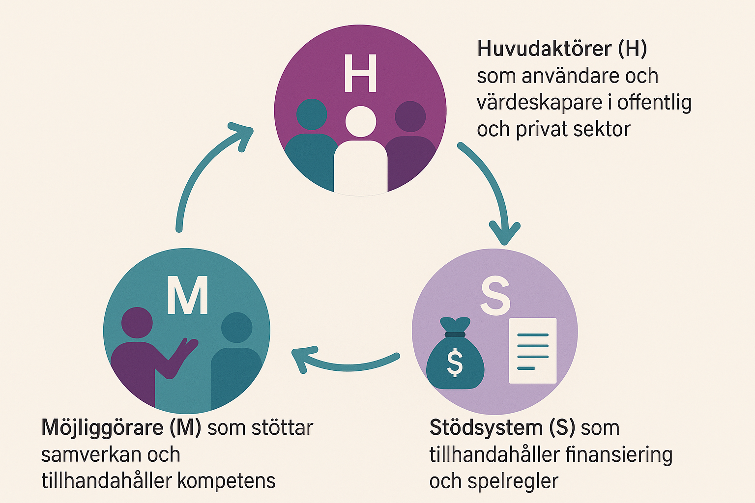 I ekosystemet samverkar huvudaktörer (H) som användare och värdeskapare i offentlig och privat sektor, möjliggörare (M) som stöttar samverkan och tillhandahåller kompetens samt ett stödsystem (S) som tillhandahåller finansiering och spelregler.